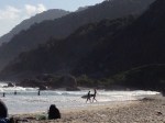 Wir stehen auf und es regnet tatsächlich. Das darf ja wohl nicht war sein – na gut, ist schon vorbei. Also packen wir unsere Sachen und wollen baden gehen. Da man am Hauptstrand des Dörfchens (Abraão) wegen der vielen Boote nicht so gut ins Wasser gehen kann/will, entscheiden wir uns für einen Strand, direkt neben dem Dorf. Auf dem Weg der „Hauptstraße“ entlang in Richtung Praia dos Pratos (soll aus schwarzem Heilsand bestehen), fällt uns positiv auf, was wir schon im Reiseführer gelesen haben: es gibt hier keine Autos. Es scheint, als ob jeder Einheimische einen Bollerwagen oder eine Schubkarre besitzt, um Einkäufe erledigen zu können. Das ist ein herrliches Bild. Auf dem 20minütigen Weg durch den Regenwald (wir sind so sportlich) sehen wir kleine Äffchen und einen riesigen Schmetterling – der würde in Deutschland Vögel fressen und nicht umgekehrt. Aufgrund der Flut gibt es kaum Strand, dementsprechend leider auch keinen schwarzen Heilsand und Andi will sich nicht auf Steine legen, die Diva. Trotzdem kann man ihn nicht abhalten ins Wasser zu springen – das erste Mal Meer auf unserer Reise – herrlich! Da der Strand nicht unsere Kriterien eines Traumstandes erfüllt, gehen wir also wieder zurück zum Dörfchen und auf der anderen (Strand-) Seite wieder heraus zum nächsten Wanderweg durch den atlantischen Regendwald, von denen es auf der Ilha Grande ca. 15 gibt. Wir wollen jetzt zum Strand von Abraãozinho. Diese Wanderwege haben, wie man das eigentlich ja auch kennt, Schwierigkeitsgrade. Zum Glück sind Lina und Andi clever genug, diese nicht zu beachten und in Beach-Montur (u.a. Flipflops) loszugehen. So dauert das kleine „Gehen-wir-eben-zum-anderen-Strand-rüber“ 1h. Aber gut, wer lesen kann ist deutlich im Vorteil. Allerdings werden wir auch belohnt, indem wir eine ca. 40cm große Echse sehen. Darüber hinaus ist dieser Strand wirklich malerisch und weist außerdem eine Beach-Bar auf, zu der wir uns sofort begeben müssen (Sportler sollen viel trinken). Neben den Caipis essen wir eine Kleinigkeit: Lina zwei ganze Fische und Andi ein paar Empanadas. Sehr lecker alles, aber viel zu viel. Zurück geht es dann mit dem Taxi-Boot. Über diese Erfindung sind wir gerade überglücklich! Mit so viel im Magen schlafen wir dann auch schnell ein. Nachdem wir gut geschlafen haben und eben aufgestanden sind, machen wir uns direkt auf zum Strand von Abraão und genehmigen uns ein paar frisch gepresste Säfte. Da nun tatsächlich ein Sturm aufkommt, begeben wir uns zurück zur Pousada. Nun ist schon Nachmittag und das Wetter wird leider nicht besser. Die Palmen biegen sich im Sturm und in unserer Regenwaldunterkunft rauscht und kracht es. Aber nicht weiter schlimm. Wir holen uns ein Fläschchen Sekt, legen uns in die Hängematten, schreiben ein bisschen was auf diese Seite, du willst ja unterhalten werden, spielen Backgammon und quatschen mit den Angestellten in Gebärdensprache, da sich unsere Portugiesischkenntnisse noch nicht signifikant verbessert haben.